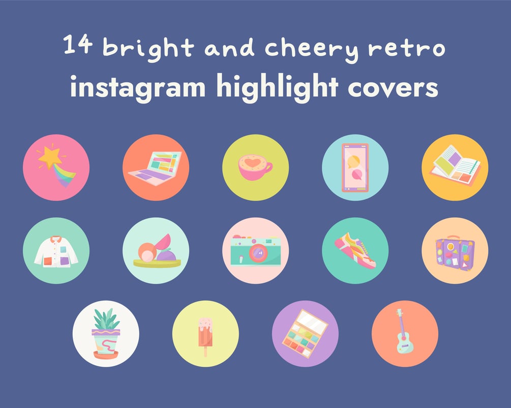 These bright cheery, retro style illustrations will add some instant colour to your instagram profile! These instagram highlight covers come as JPEGs that are ready to use and input into your highlights, or PNGs of the icons if you want to place them into your own backgrounds. Comes with 14 icons!