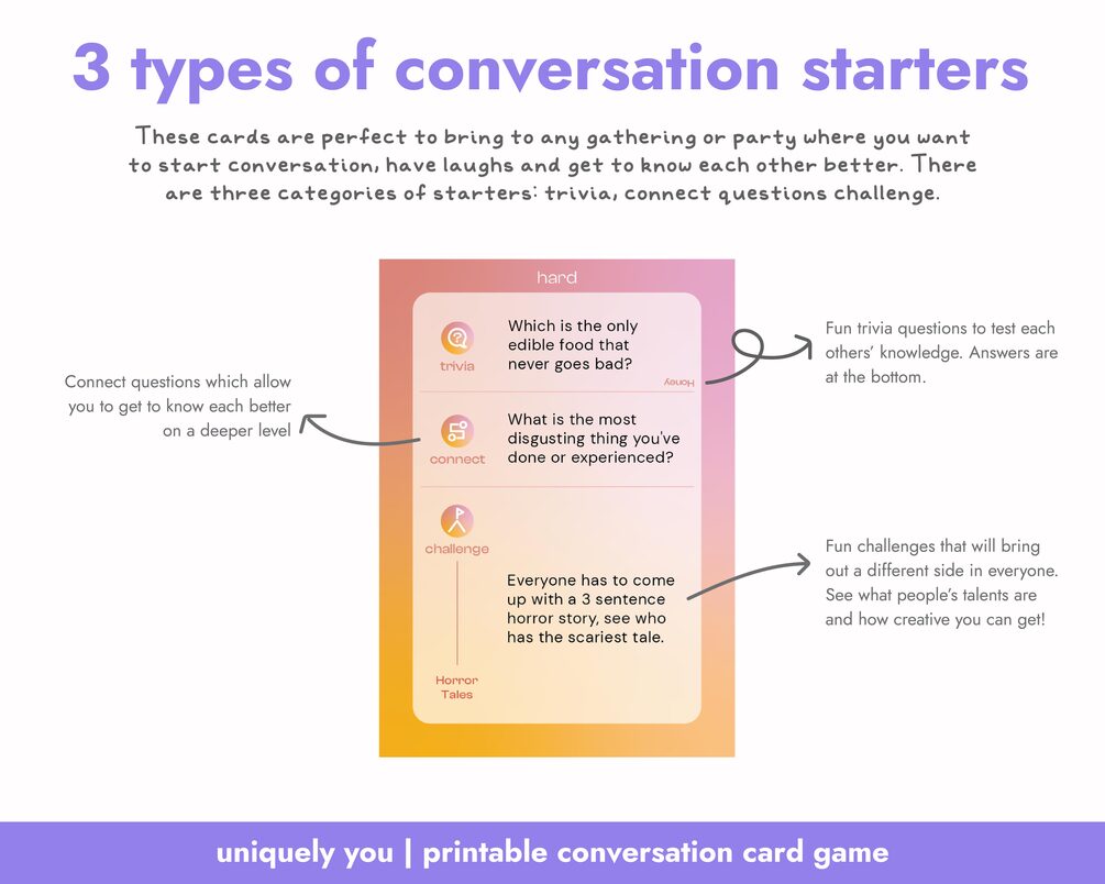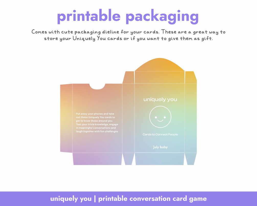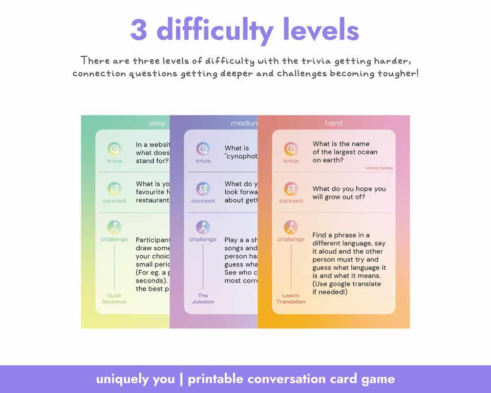 Uniquely You is a printable conversation card game that aims to connect friends, family and partners. Get to know the people around you better with trivia, connection questions and fun challenges.