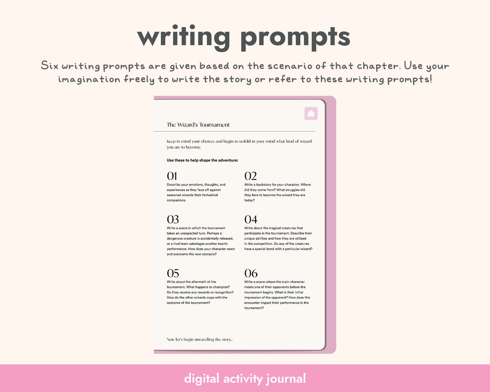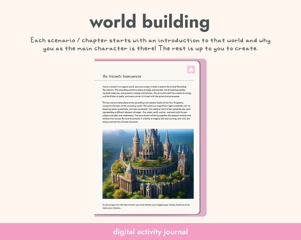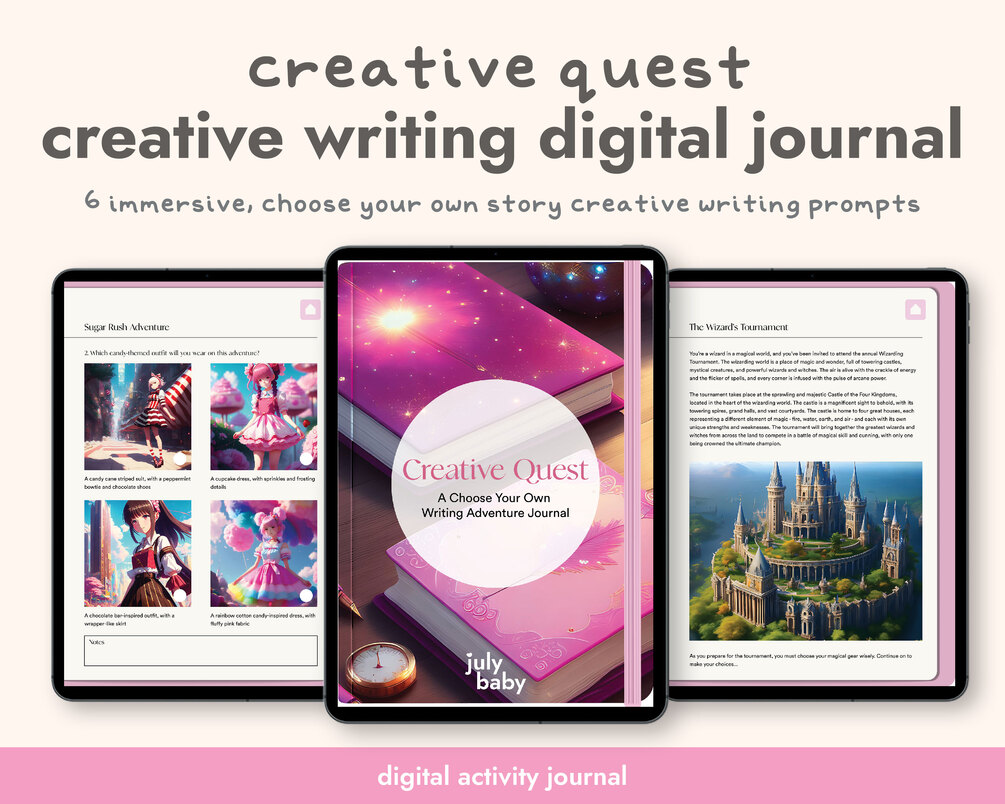 Get ready for an adventure with Creative Quest: Choose Your Own Writing Adventure, a digital activity journal that encourages creativity and imagination! With six fun scenarios set in different worlds, this book will challenge your writing skills and spark your creativity. You'll enjoy exploring a magical land, a futuristic world, and more.