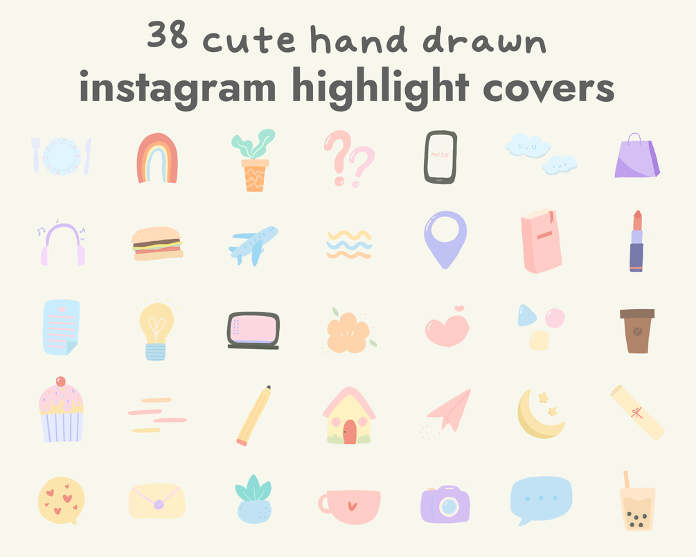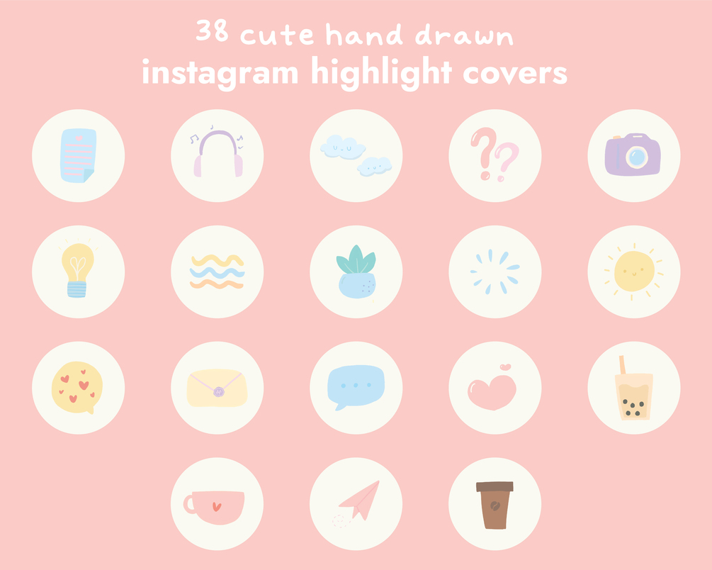 These cute instagram highlight covers will instantly add some happiness into your instagram profile! JPEGs that are ready to use and input into your highlights, or PNGs of the icons if you want to place them into your own backgrounds. Comes with 38 icons!