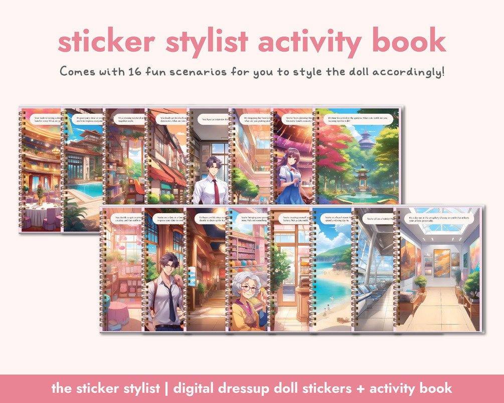 It comes with 88 various fashion stickers and a pretty doll that you can dress up in a whole bunch of different outfits! The activity book comes with 16 vibrant colourful backgrounds and scenarios for you to style your doll accordingly. Continue using your dressup doll stickers in your other digital journals and notebooks too!