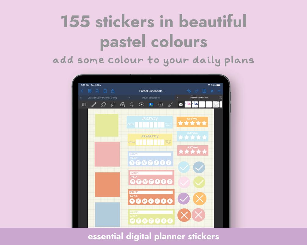 155 digital planner stickers in soft pastel colours! Use these in your digital goodnotes planners or notebooks to add some colour and organise your content. Comes with a variety of functional stickers such as lists, tables, date reminders, schedules and labels. Also comes with decorative stickers such as sticky notes and encouraging callouts.