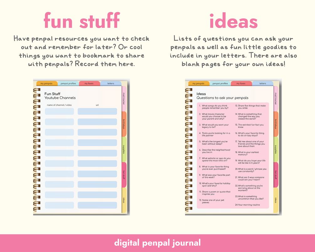 -Fun Stuff: Have penpal resources you want to check out and remember for later? Record them here. Or you can even add your fave youtube channels, social media and websites to share with your penpals