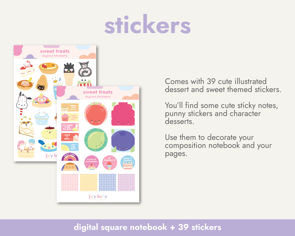 Square Digital Notebook Kawaii Digital Journal with Cute Dessert Character Stickers Kawaii Digital Stickers