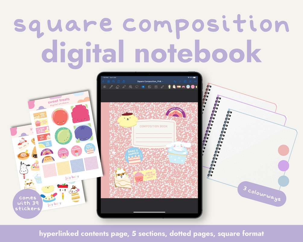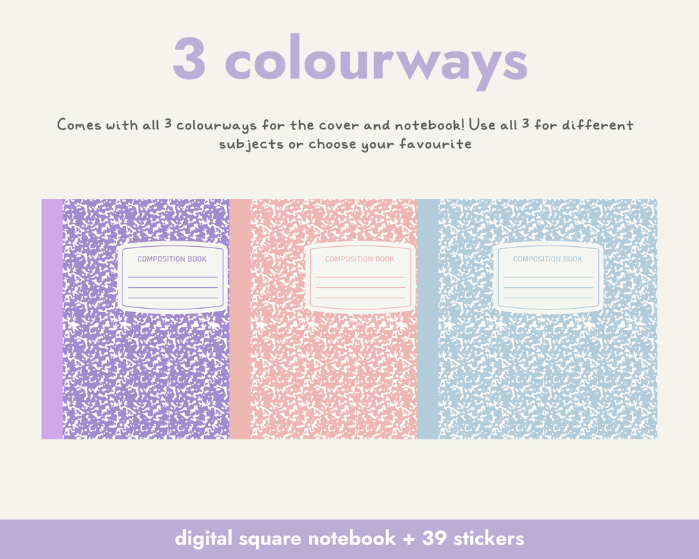 A cute composition design digital notebook that comes in a pack of 3 different colourways: pink, purple and blue. Perfect to add to your GoodNotes notebook collection.