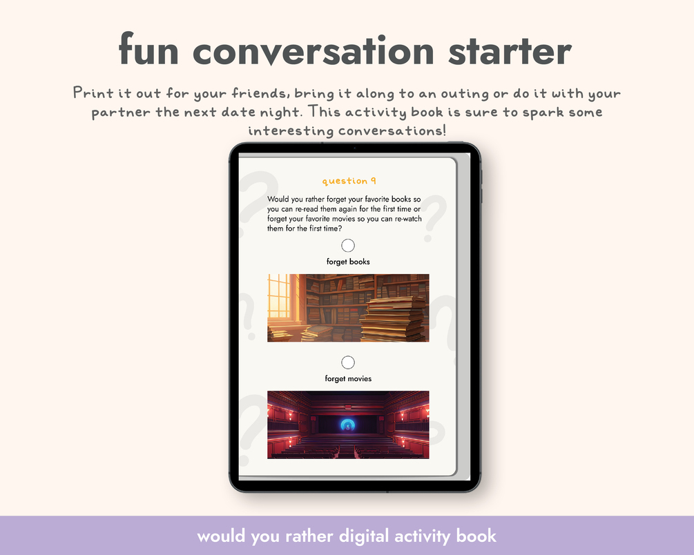 Have fun on a quiet night in or with your friends with this "Would You Rather" digital activity book! Packed with 60 fun and thought-provoking questions, this unique book is perfect for teens and adults. Explore interesting scenarios, all with illustrations that make it more enjoyable! Use this activity book with friends to spark lively discussions and laughter-filled conversations or use it as a fun activity for yourself!